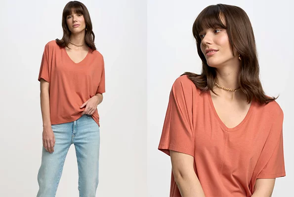 Peach Fuzz doskonale wygląda w połączeniu z denimem – zarówno jasnym, jak i ciemnym. Jeansowe spodnie, kurtki czy spódnice w połączeniu z elementami w tym brzoskwiniowym odcieniu tworzą casualowe, ale stylowe zestawy. Inny pomysł – solidna bawełna. Brzoskwiniowy top i chinosy damskie to świetne “kombo” na wiosnę 2024. Do tego koloru pasują także wzory i nadruki – kwiatowe, geometryczne czy nawet zwierzęce printy mogą dodać stylizacjom ciekawego charakteru.